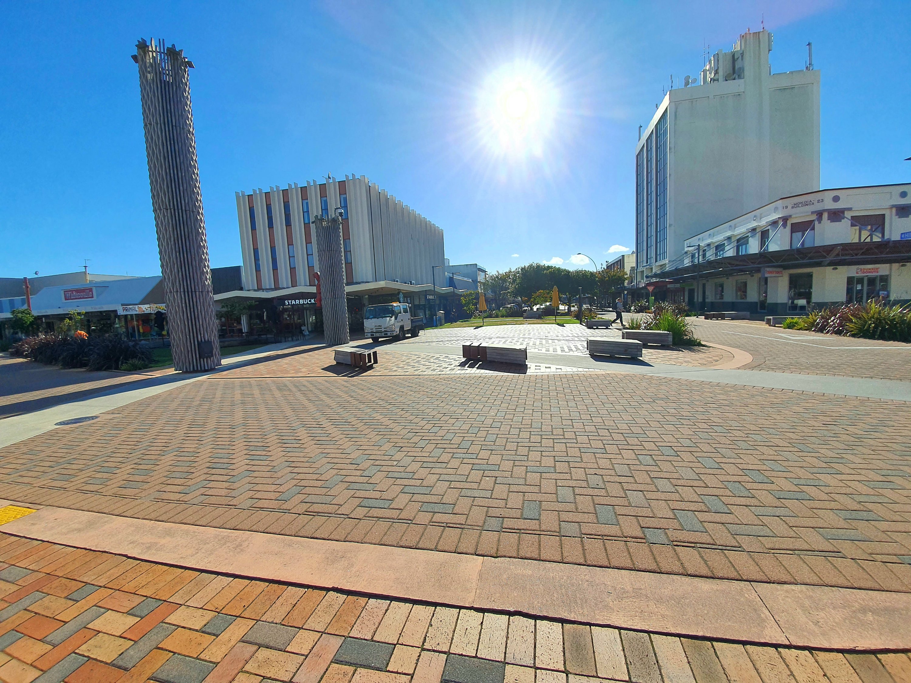 Rotorua streets now landscaped for paved terraces and walkways, slowing and limiting traffic. A comfortable people-feel. Street sculpture and planting much improves the environment.